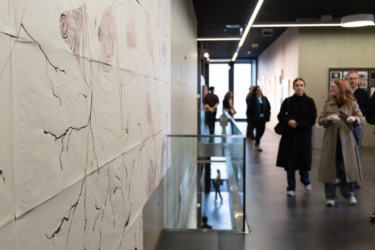 The present captures, for a moment, presence and absence in a large ink drawing, recomposable like truth itself. It will partially unfold across the walls of the Centre des Arts.