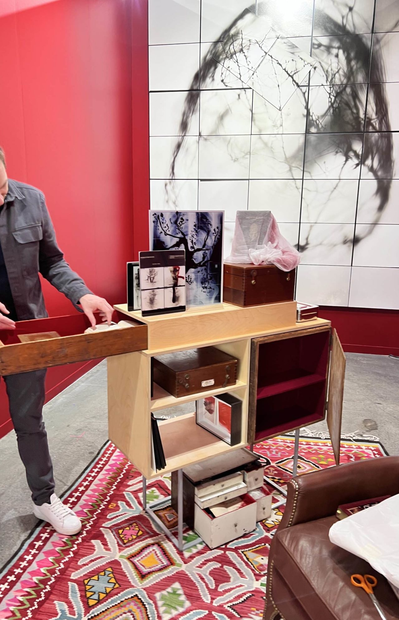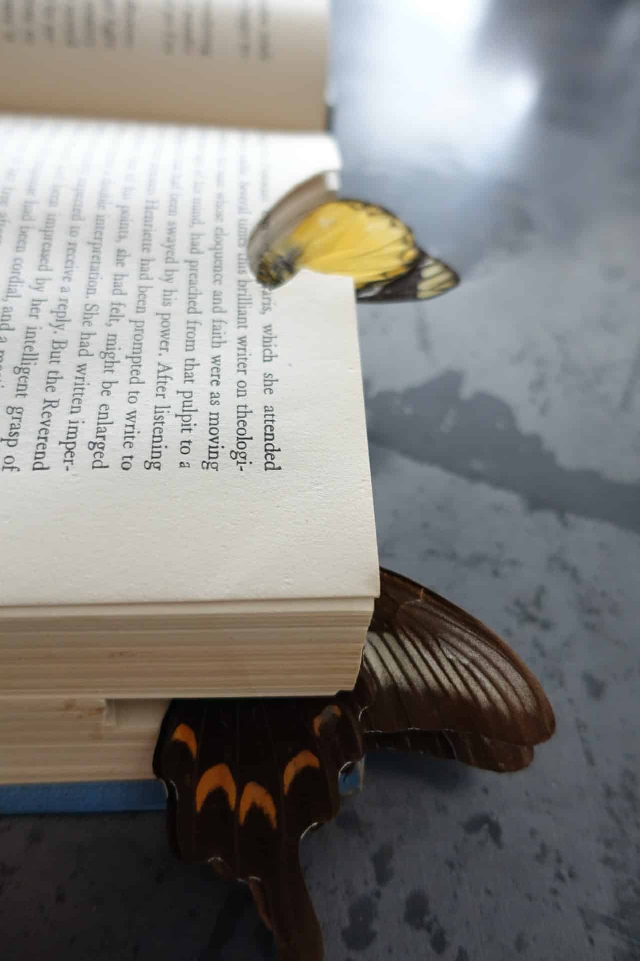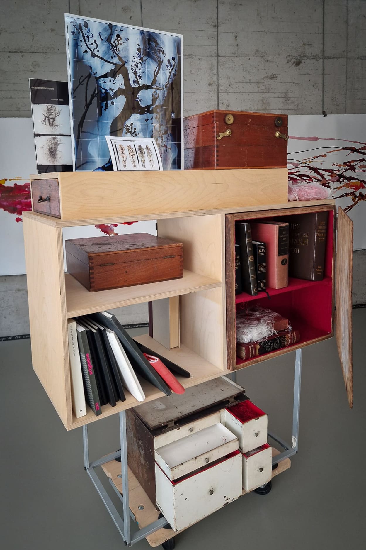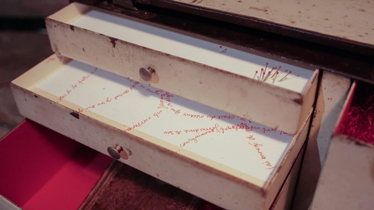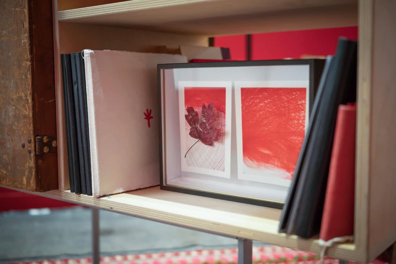 Si la curiosité nous faisait nous approcher et le toupet en ouvrir la porte, si l’inconscience de tenir là une oeuvre dite d’art et non un livre nous fai- sait ouvrir l’un d’eux, on découvrait à l’intérieur que les mots avaient été creusés et laissaient la place à un autre monde plus visuel et tout aussi symbolique. Dans le tiroir des papillons avaient fait leur cocon et s’ap- prêtaient à s’envoler ou à rester, transformant la chrysalide en linceul.