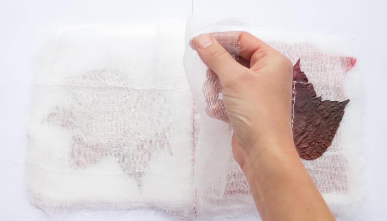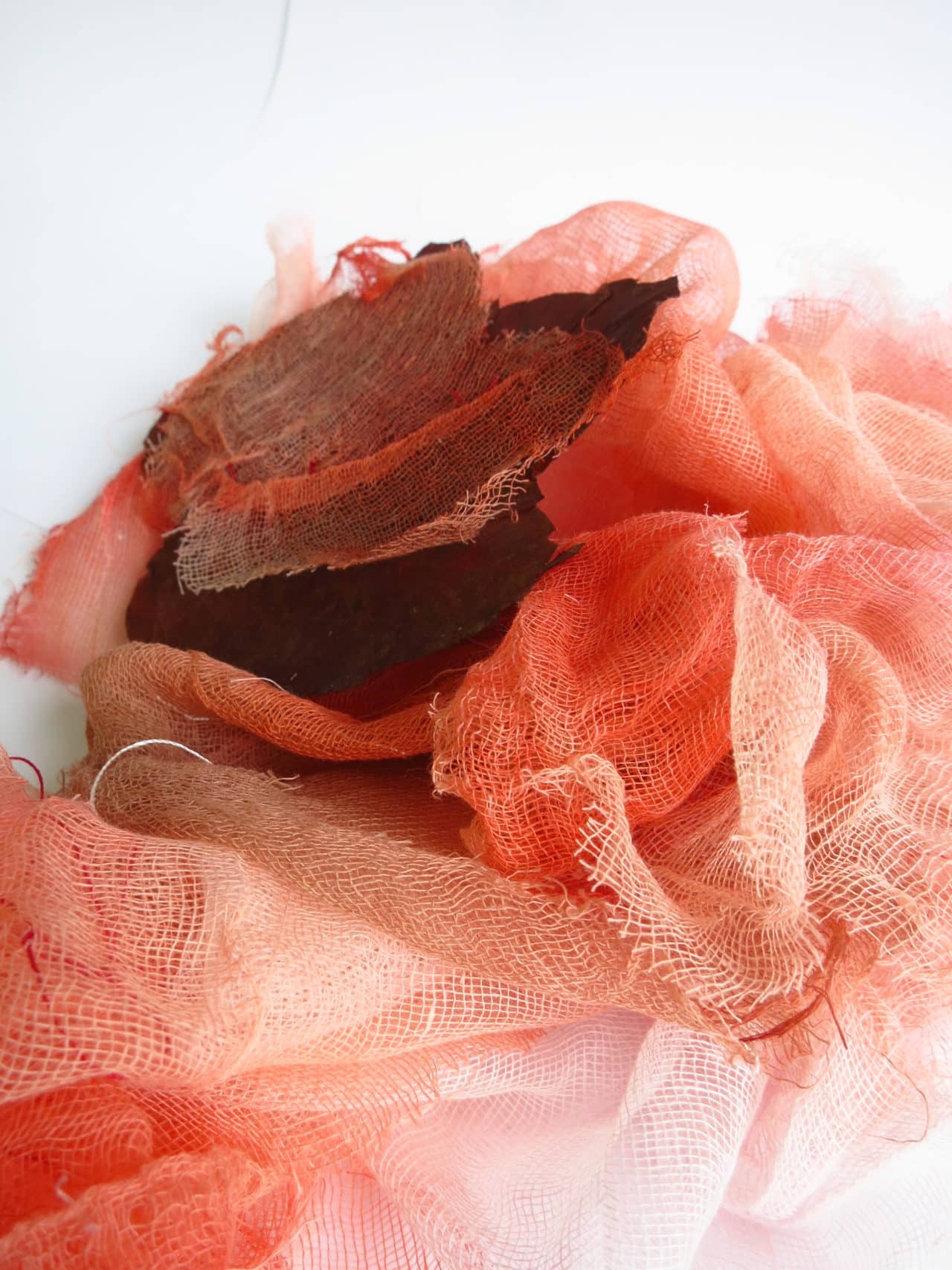 interprétation 3 : 29 pages de gaze, feuilles, encre rouge, plume et fleurs sèches